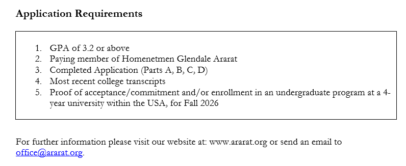 Homenetmen Glendale Ararat is pleased to announce the “Vahe Ardsroony Endowment Fund Annual Scholarship” award event. One scholarship of $1,000 will be awarded to a student transferring from a community college to any undergraduate university program within the USA during the academic year of 2026-27. While this Scholarship is open to all eligible members of Homenetmen Glendale Ararat, it aims to benefit those students who have some involvement with the Armenian community and the local society. Therefore, in conjunction with Homenetmen’s mission of cultivating healthy minds in healthy bodies, the recipient of the “Vahe Ardsroony Endowment Fund Scholarship” must be a student who can demonstrate leadership qualities and an understanding of the needs of the Armenian people and their role in the Armenian community.